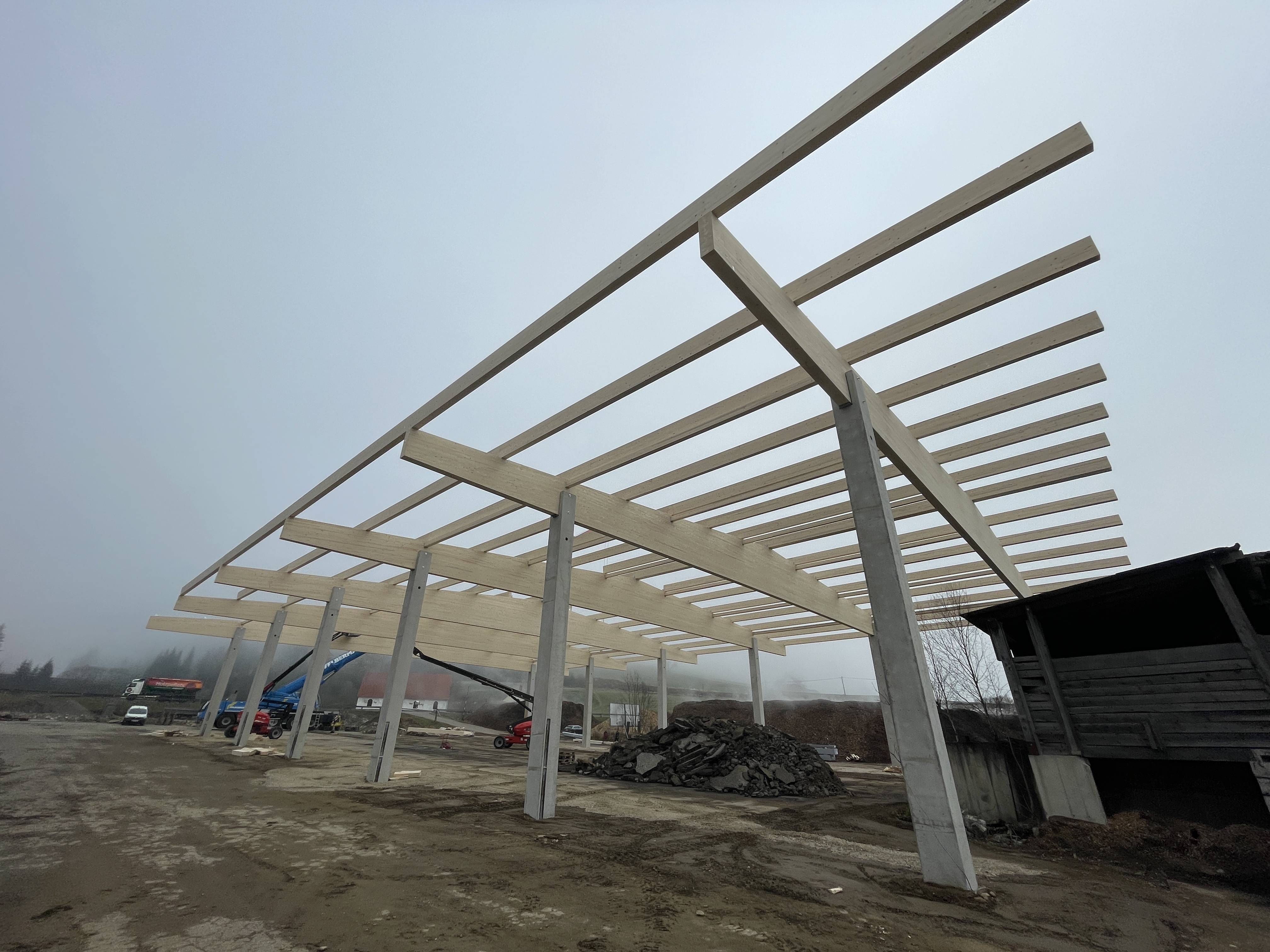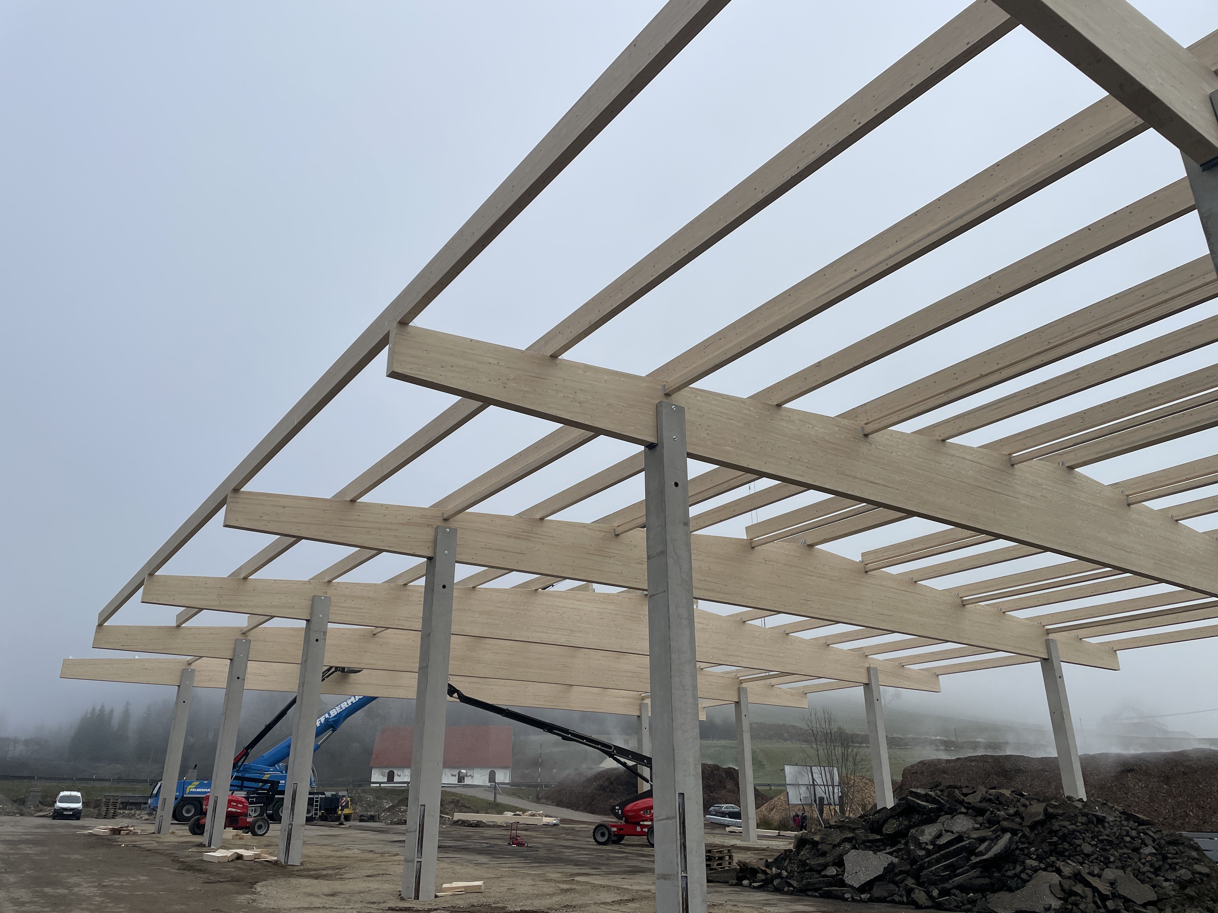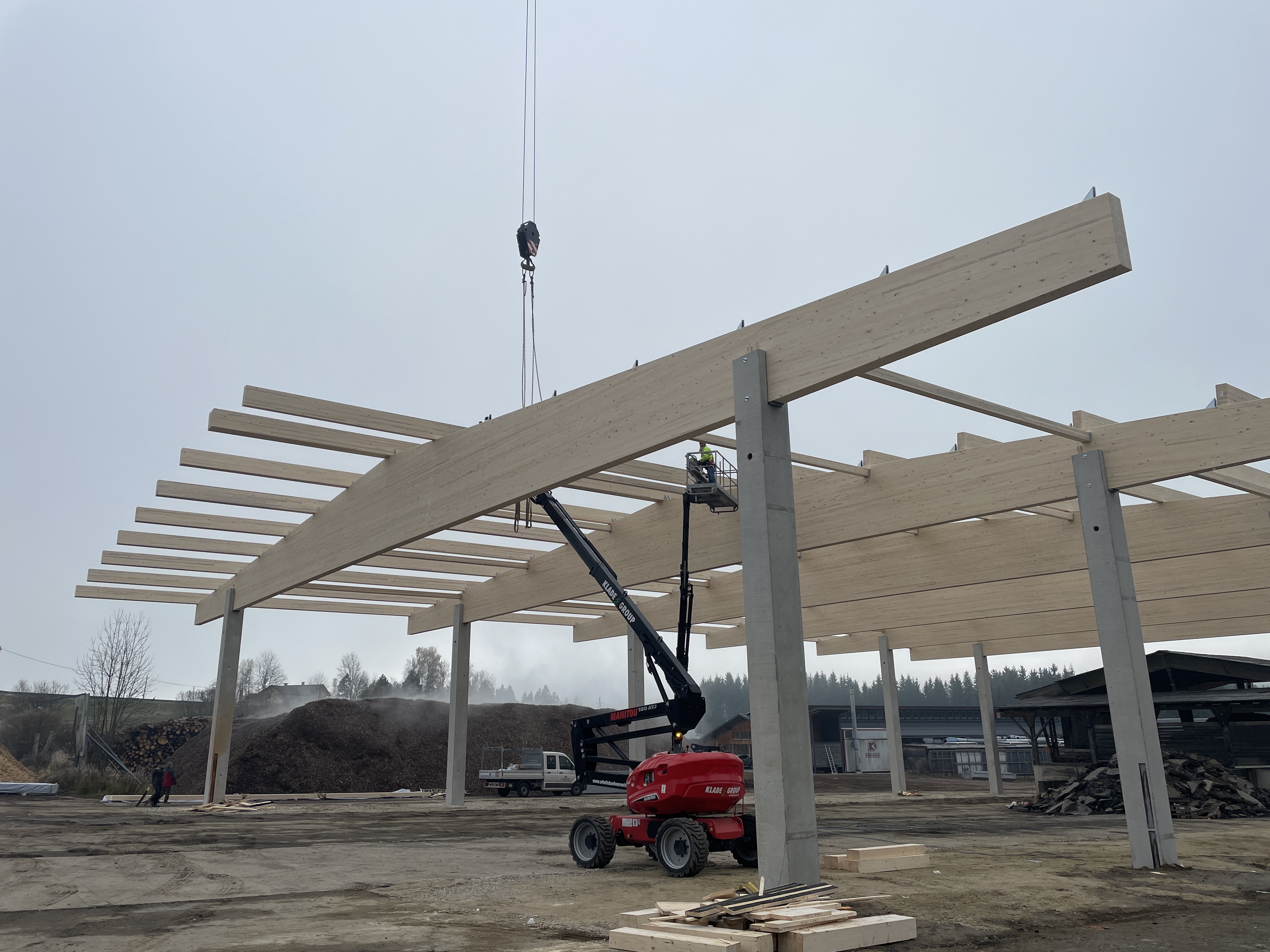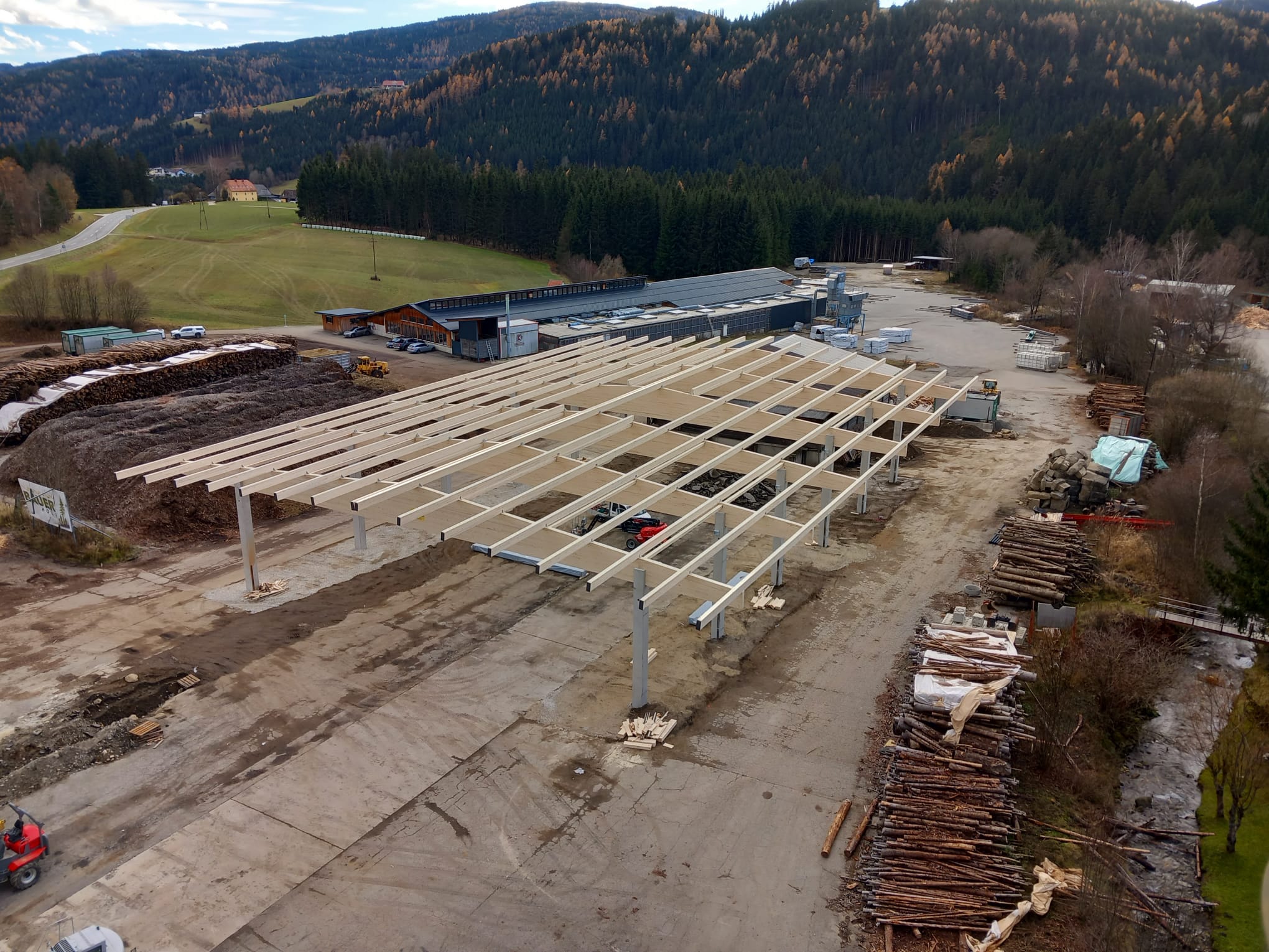 Projektbeschreibung: Auf dem Areal der Fa. Papst Hack Express wurde eine neue Lagerhalle mit einer Fläche von ca. 1620m² errichtet. Die Dachkonstruktion mit den über 41m langen Satteldachbinder hat eine Gesamtfläche von ca. 2300m²