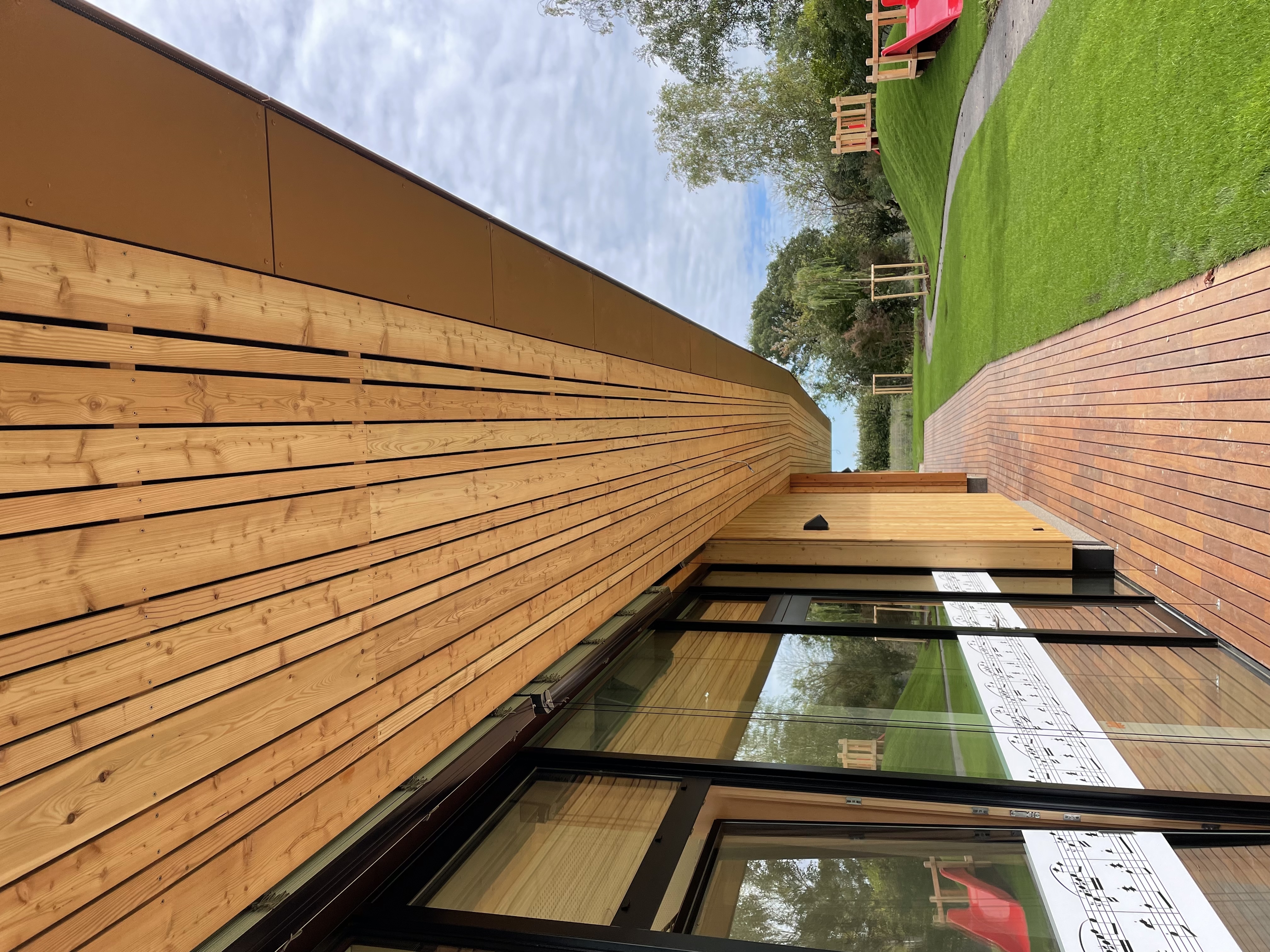 Projektbeschreibung: In Atzenbrugg wurde ein Neubau in Holzmassivbauweise realisiert. Die Gesamte Fassade besteht aus einer offenen Glattkant Lärchenfassade sowie teilweise aus Eternit Platten. Insgesamt wurden 2 neue Gruppenräume inkl. Garderoben, Sanitär und Bewegungsraum geschaffen. Die Bruttogeschossfläche beträgt ca. 800m², Die Fassadenfläche beträgt rund 550m² Es wurden ca. 360m³ Brettsperrholz verbaut.