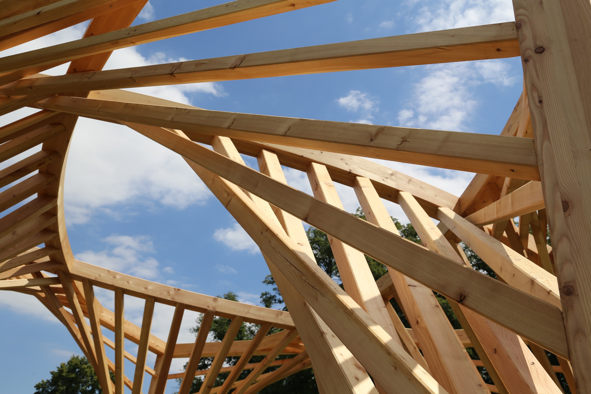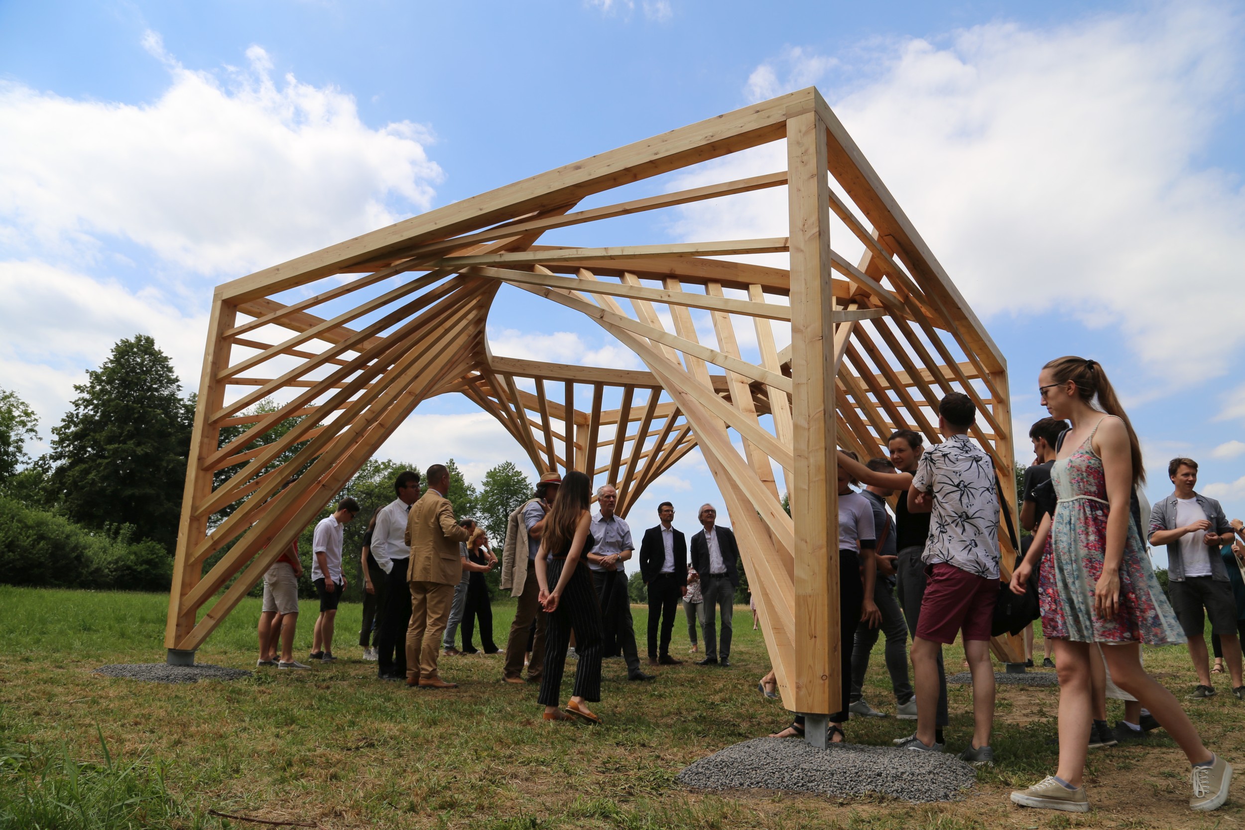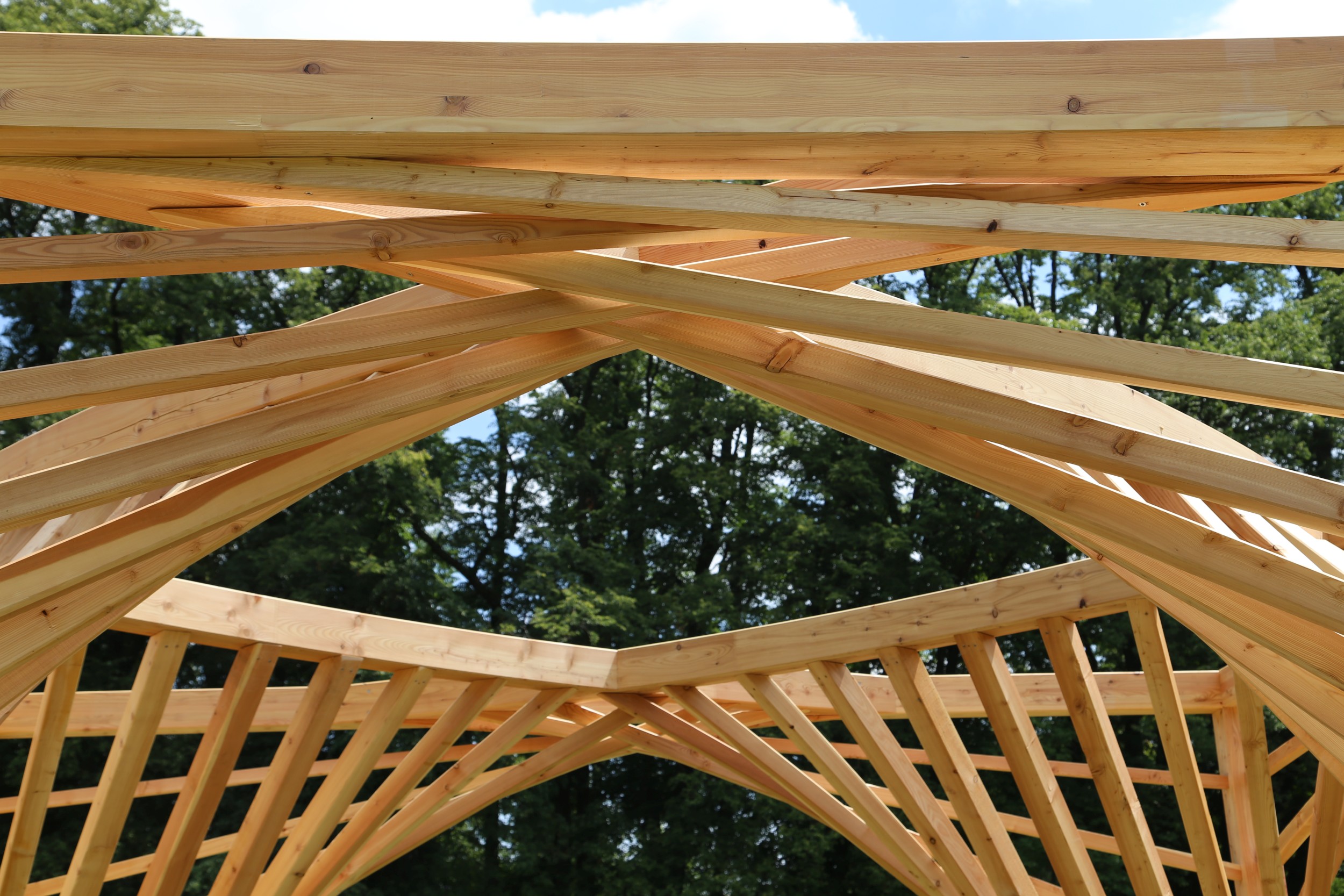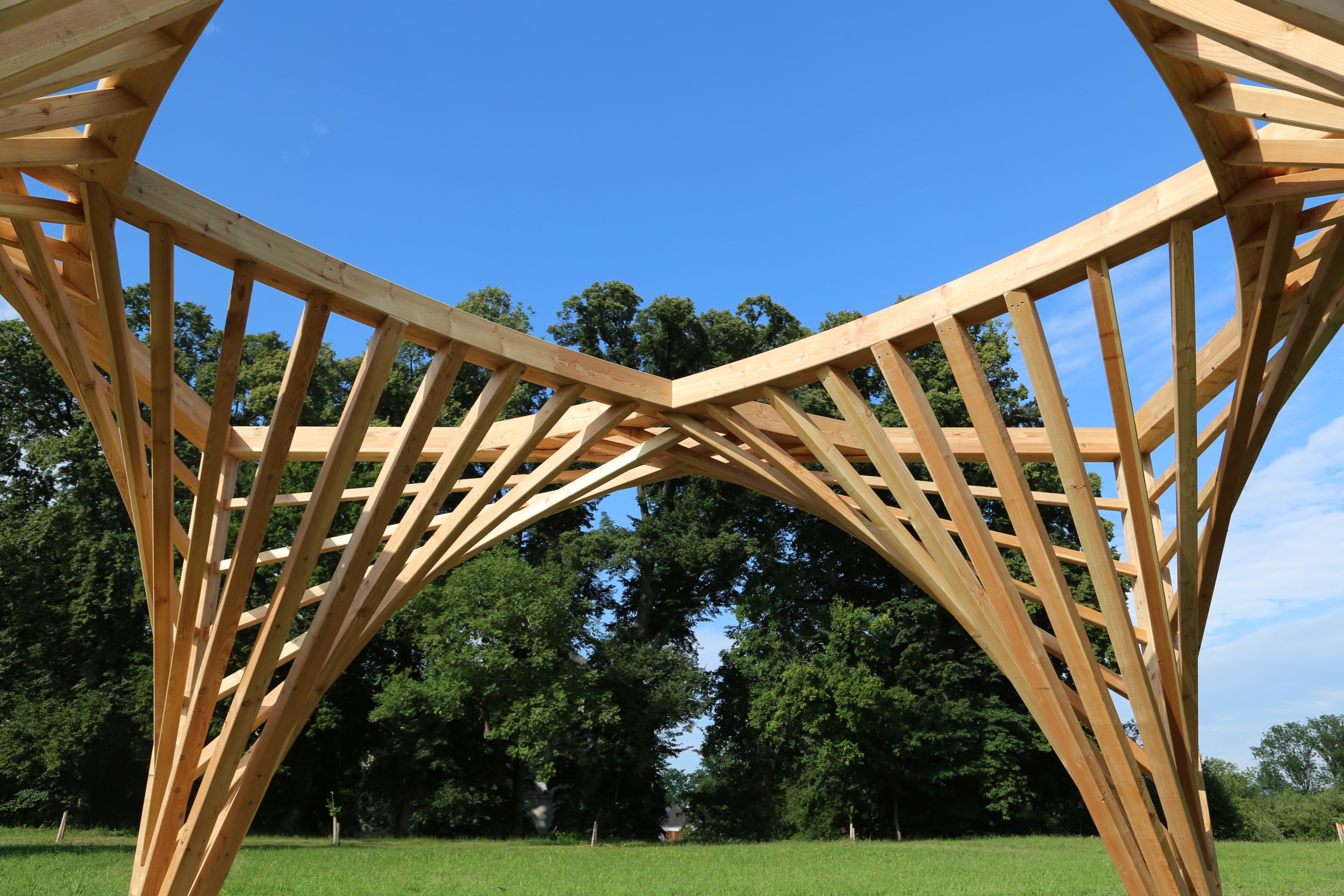 Projektbeschreibung: In Zusammenarbeit mit Studenten der TU Graz wurde amn Areal des Schloss Lackenbach wieder ein sehenswerter Holzbau errichtet. Die "Swirling Flower" besticht durch die besondere Anordnung der ausstreifenden Holzlatten und verleiht ihm eine unverwechselbare geometrische Form.