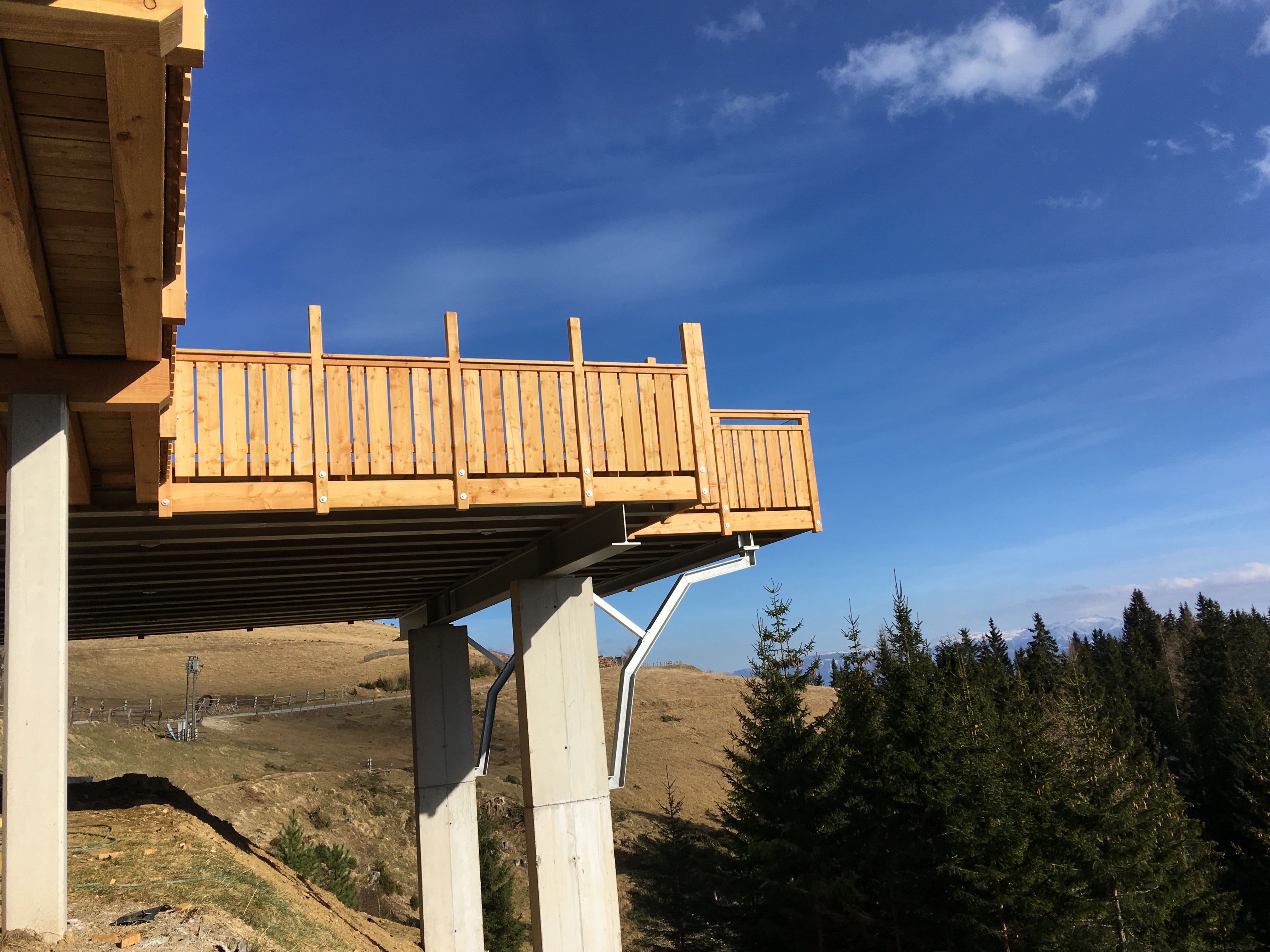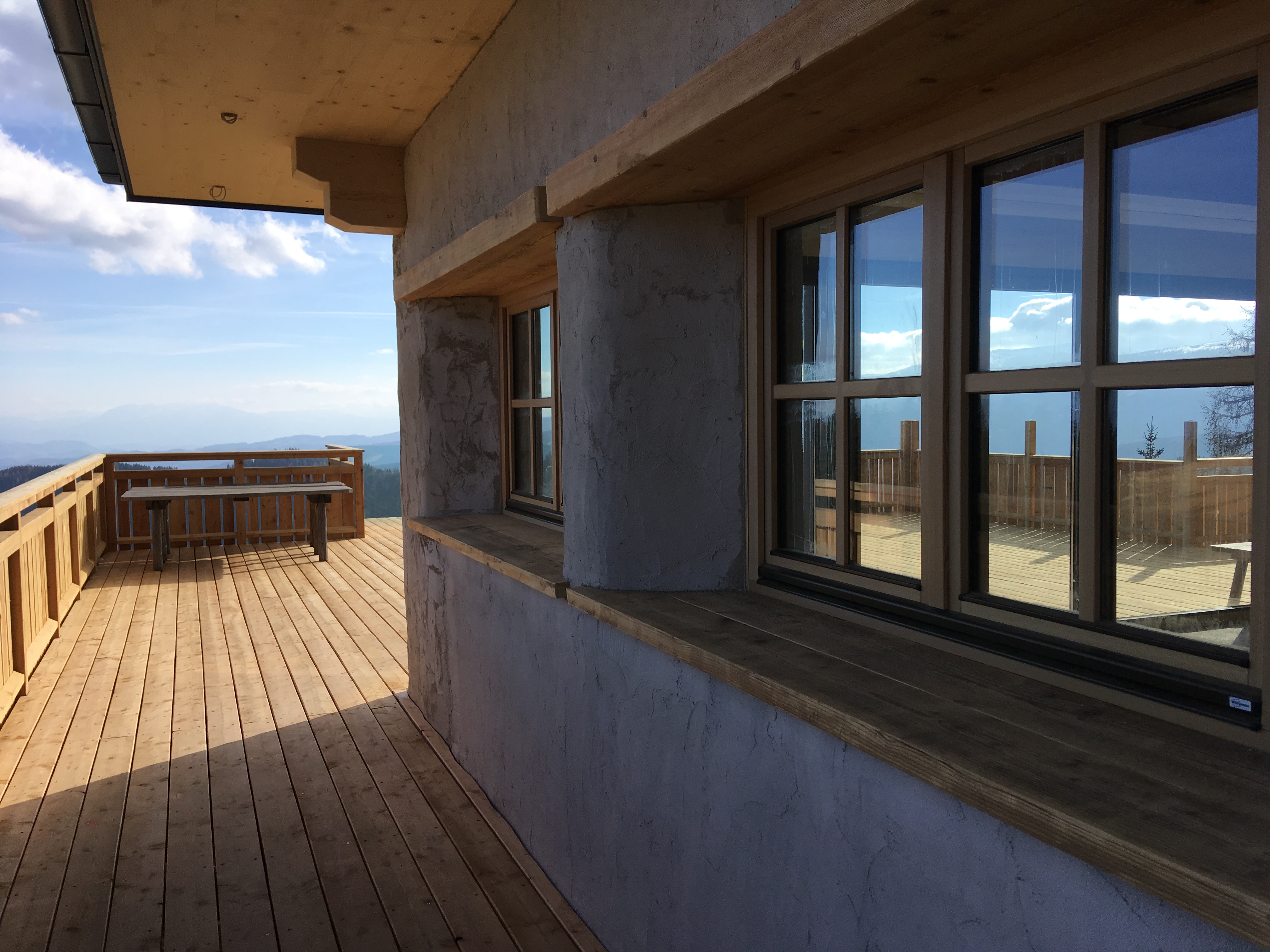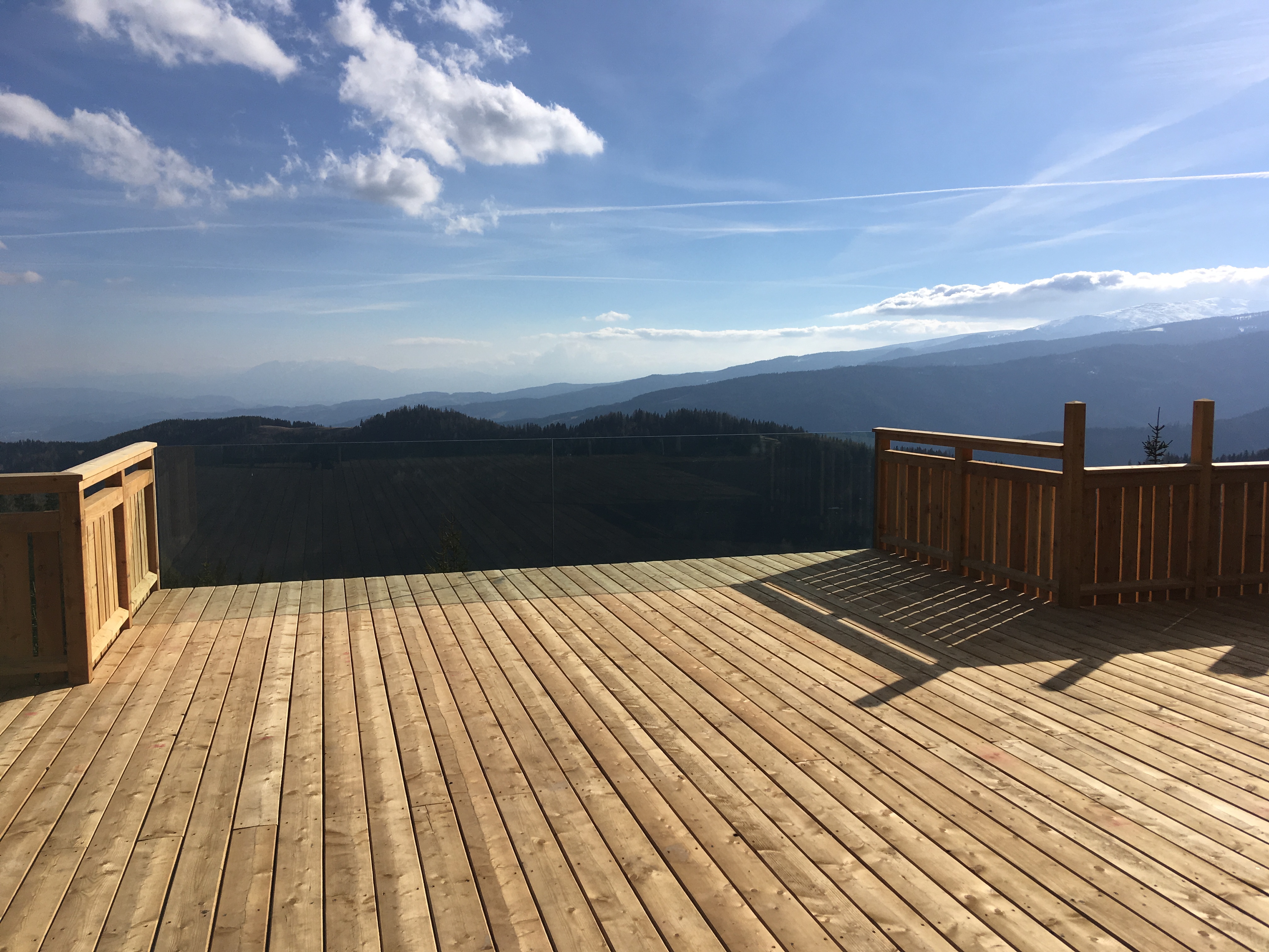 Projektbeschreibung: Gastraumerweiterung in Brettsperrholzkonstruktion und Terrassenvergrößerung mit Lärchenholz. Durch die Panoramaverglasung überwältigt sie mit einem hervorragendem Ausblick.